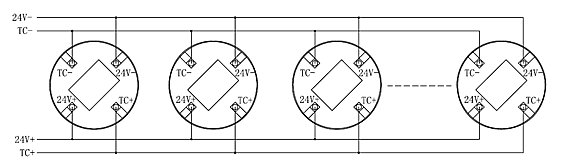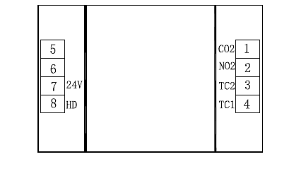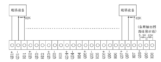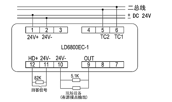 1脚24V+,2脚24V-必须分极性,5、6脚接入TC+、TC-,11、12脚和3、4脚分别为两组现场反馈信号接入点,需要接82K线路检测电阻。9、10脚和7、8脚为24V输出,接5.1K线路检测电阻。