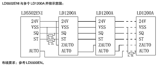 5.LD4400EN-1/2输入模块端子图与接线图示例(如图1.6、1.7所示):6脚5脚是二总线TC+,TC-原则上不分正负极,11脚12脚是一组无源长开点,8脚7脚是一组无源长开点。端子现场设备上需要加15K线路检测电阻。